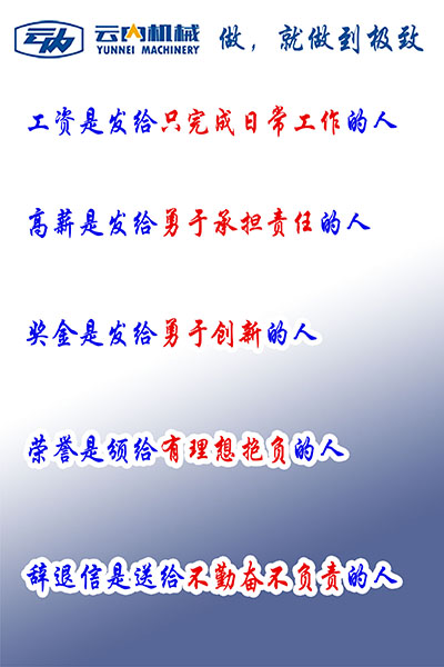云內(nèi)機(jī)械是一家追求全體員工和合作伙伴精神與物質(zhì)兩方面的滿意和幸福,并致力于為中國制造增光添彩的優(yōu)秀企業(yè), 我們每一個(gè)員工把云內(nèi)機(jī)械當(dāng)做自己的公司,把自己當(dāng)做公司的經(jīng)營者,員工與云內(nèi)機(jī)械是命運(yùn)共同體,忠誠的、勤奮的、 積極的、善于學(xué)習(xí)的、勇于擔(dān)當(dāng)“信使”的員工,是企業(yè)的核心競爭力,是企業(yè)的財(cái)富。員工之間不僅僅是同事關(guān)系,更是 為了同一個(gè)目標(biāo)而共同奮斗的伙伴關(guān)系;我們的合作伙伴,不僅包括設(shè)備廠商、供應(yīng)商、代理商,更包括廣大的終端消費(fèi)者,云內(nèi)機(jī)械與合作伙伴是攜手共進(jìn),風(fēng)雨同舟的命運(yùn)共同體。 我們共同致力于持續(xù)、穩(wěn)健、誠信的生產(chǎn)經(jīng)營,追求業(yè)績的最大化和合理的盈利,我們通過持續(xù)改善產(chǎn)品品質(zhì)、堅(jiān)持提高服 務(wù)水平,不斷提升客戶滿意度。企業(yè)的發(fā)展離不開國家和社會(huì)各界的支持,國家強(qiáng)盛為企業(yè)創(chuàng)新和發(fā)展提供良好的平臺(tái),我 們不僅要發(fā)展壯大企業(yè),更要放眼世界,追求技術(shù)創(chuàng)新和產(chǎn)業(yè)升級(jí),為中國制造增光添彩,為中國制造走向世界貢獻(xiàn)力量。